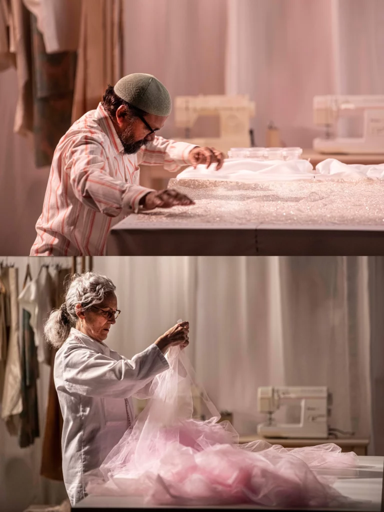 Un écran complète ce dispositif en projetant les gestes invisibles du travail artisanal, rendant palpable la minutie d’une couture ou d’un fil de dentelle. Comme souvent chez Caroline Guiela Nguyen, l’image vient prolonger le plateau, brouillant les frontières entre cinéma, série et théâtre.