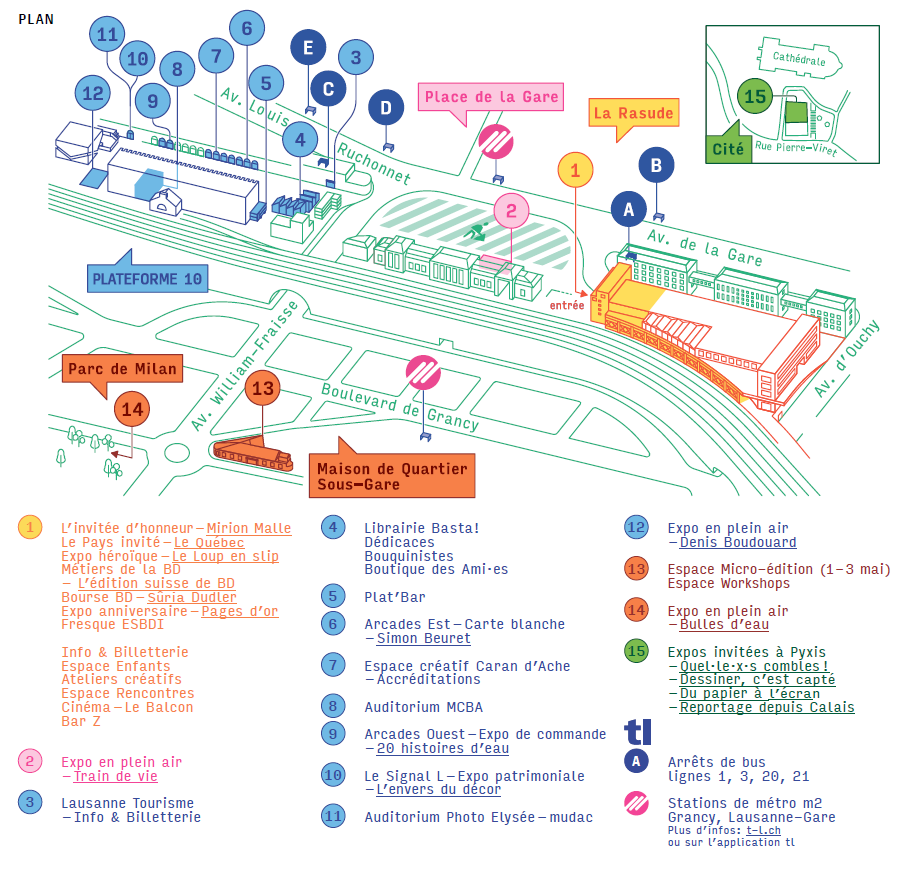 Pendant deux semaines, Lausanne devient un terrain d’expression pour la bande dessinée. Le quartier de la gare accueille le cœur du festival, mais BDFIL déborde largement de ses espaces principaux.